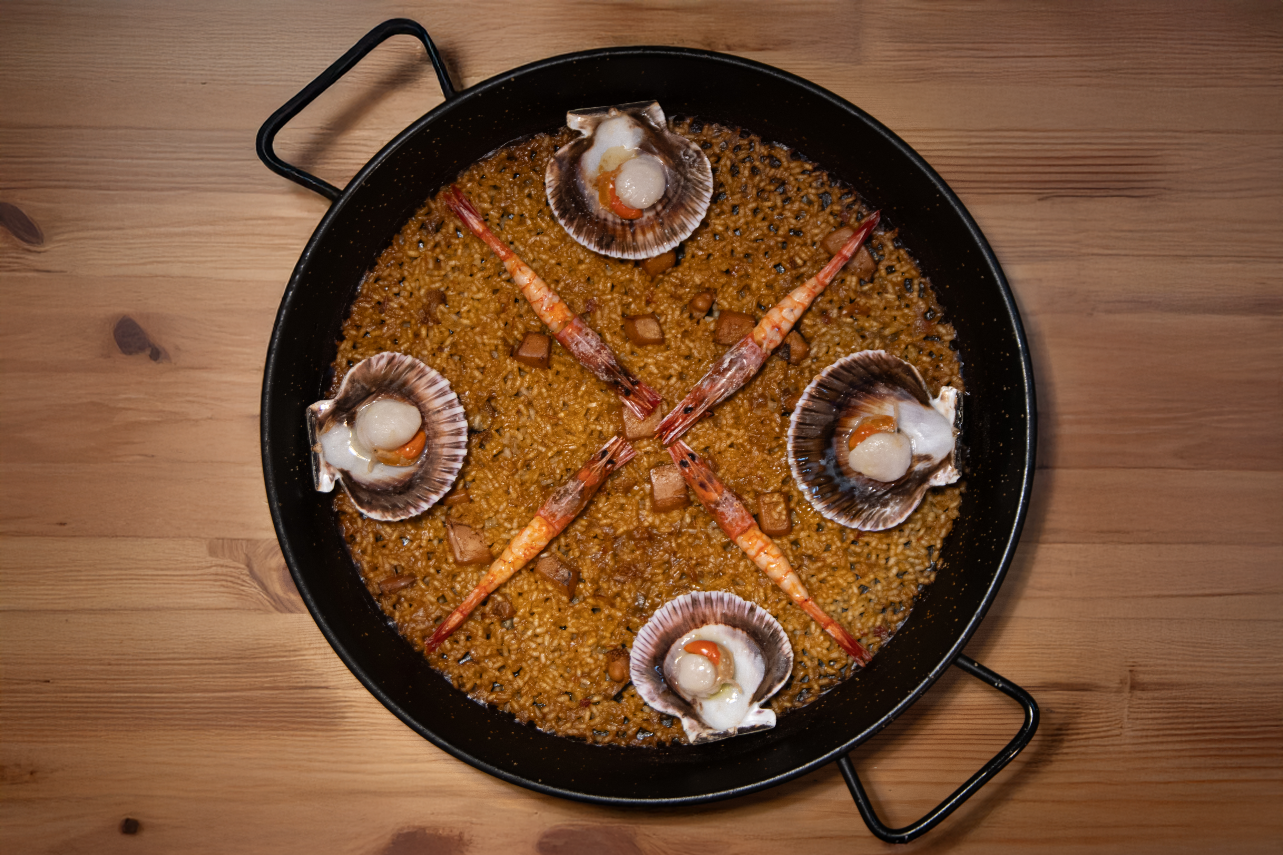 Arròs cuinat amb un fons intens de marisc i peix net, potenciat amb una marca de sípia fresca, pebrots escalivats i el coral de la mateixa sípia, que aporta profunditat i un sabor marí inconfusible. Cada ració se serveix amb dues zamburinyes al punt i dues gambes vermelles.