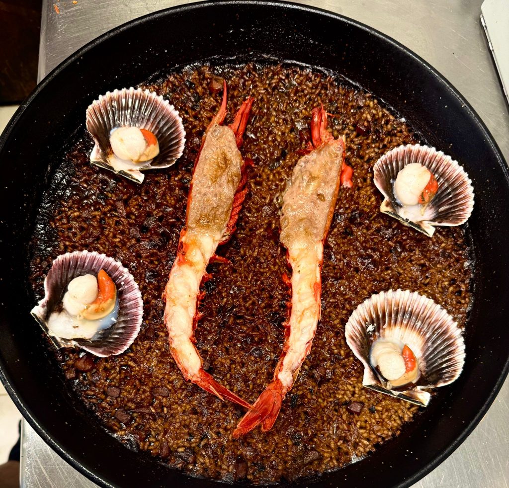 Arroz cocinado con un fondo intenso de marisco y pescado limpio, potenciado con una marca de sepia fresca, pimientos escalivados y el coral de la propia sepia, que aporta profundidad y un sabor marino inconfundible. Cada ración se sirve con una zamburiña en su punto y dos gambas rojas